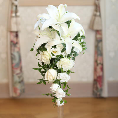 チャペルの雰囲気にぴったりなユリのキャスケードブーケ。