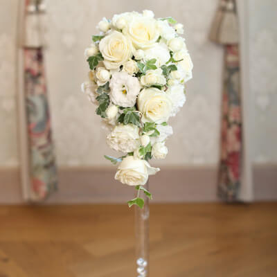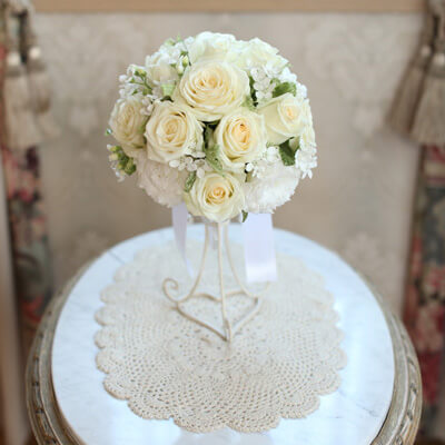 白・グリーンの色合いでシンプルなバラのキャスケードブーケ。