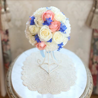 サーモンピンクとブルーの爽やかな色合いのバラのラウンドブーケ。