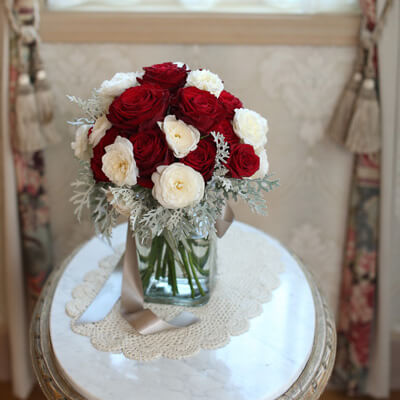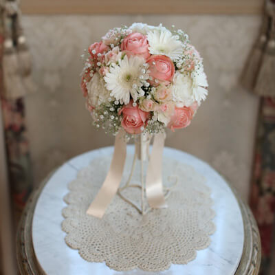 ピンクと白の組み合わせがかわいらいしいラウンドブーケ。